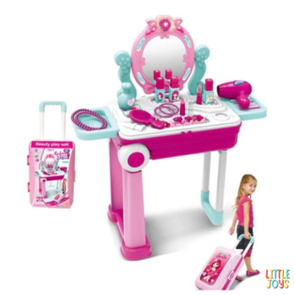 ➡️Highlight "Mess-Free" Storage: Appeal to parents' desire for organization by using signage that emphasizes how all the loose accessories (makeup, jewelry, dryer) pack neatly inside the case for easy cleanup and clutter-free storage.